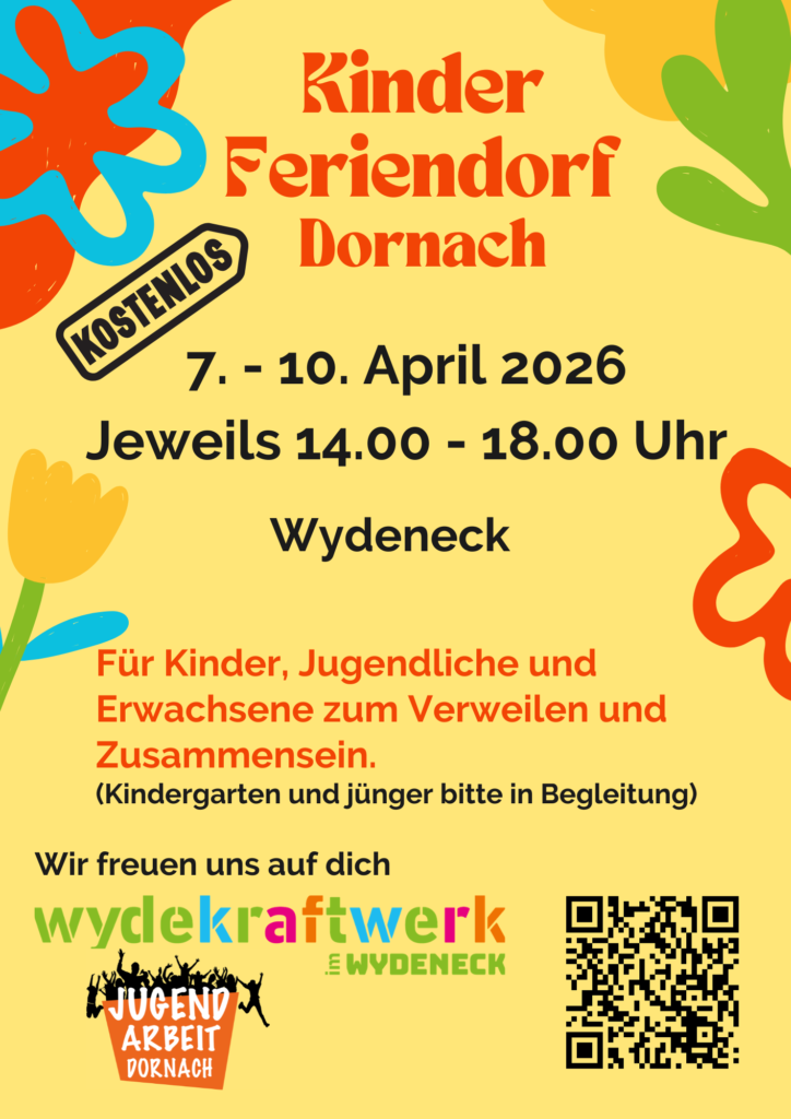 Endlich ist es wieder so weit: In der zweiten Osterferienwoche verwandelt sich das Wydeneck-Areal (ehemalige Swissmetall) erneut in einen Ort voller Kreativität, Bewegung und Begegnung. Vom 7. bis 10. April 2026 laden wir euch täglich von 14.00 bis 18.00 Uhr ein, Teil des preisgekrönten Kinderferiendorfs zu werden.
