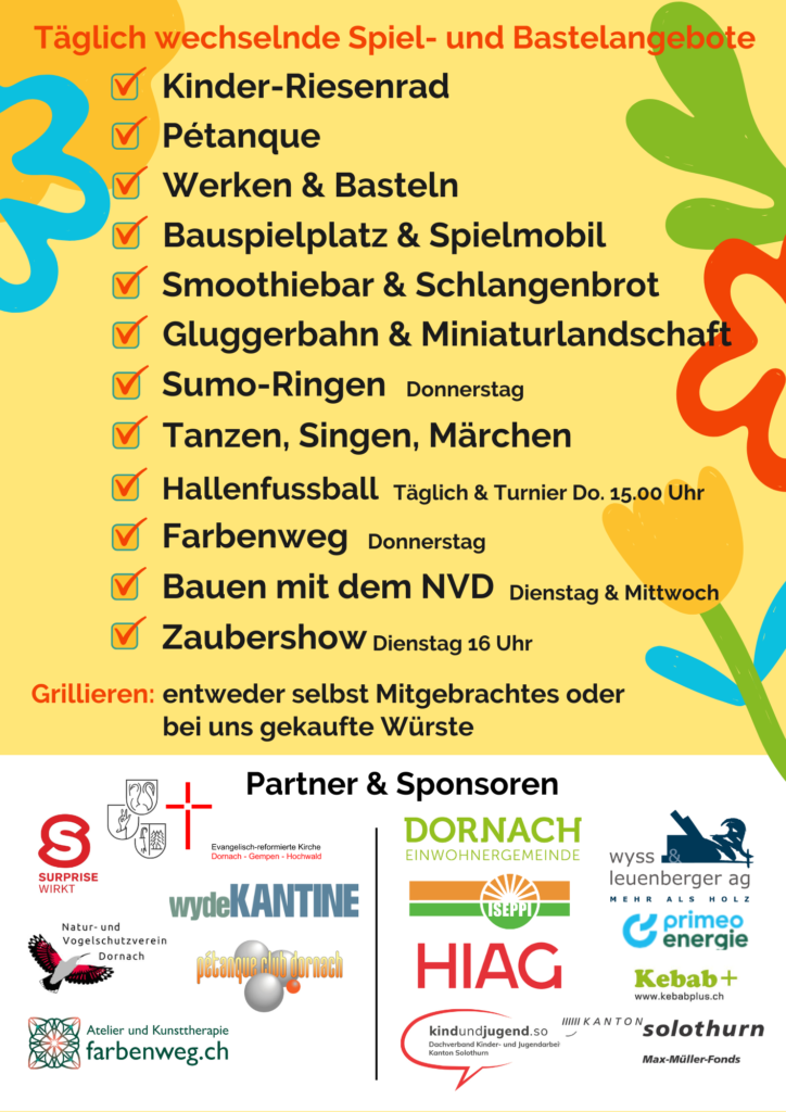 Das Kinderferiendorf ist mittlerweile ein fester Bestandteil der Dornacher Ferienlandschaft und wurde 2025 stolzer Gewinner des Ehrenpreises des Jugendprojektwettbewerbs des Kantons Solothurn. Auch 2026 stehen Partizipation und Niederschwelligkeit im Fokus: Ihr seid nicht nur Gäste, sondern gestaltet als „Dorfbewohner“ das Programm aktiv mit.