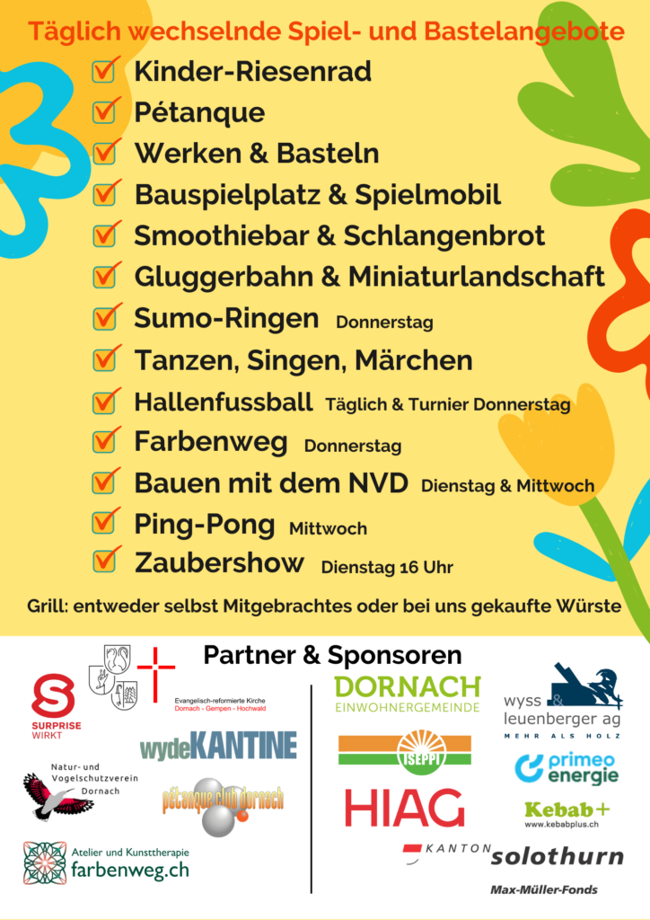 In den Frühlingsferien findet jeweils das Kinderferiendorf in Zusammenarbeit mit dem wydenkraftwerk auf dem ehemaligen „Swissmetall-Areal“ statt. Im 2026 fand das Kinderferiendorf vom 7. – 10. April statt. Dieses Jahr gab es wieder viele verschiedene und auch neue Aktivitäten. Das strahlende Sonnenwetter lockte zahlreiche Kinder und Familien an.